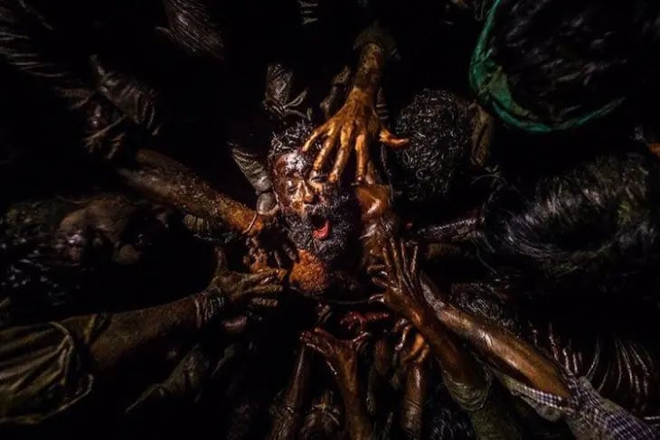 The mob despite all the proclaimed civilized nature of human beings, take spears and hunt like wild animals. The film shows that the culture and sophistication we boast about are nothing but a thin curtain hiding our bestiality. The beast within can come out at any time and destroy everything created by human civilization. The buffalo destroys many social institutions on its mad run into the forest. At one point, the flag post of a political party is pulled down. But the comrades who gather there to discuss the issue are interrupted by some violent men. Thus, no fruitful discussion is possible in a society in which violence predominates. Communism itself is shown as having no device for a solution to the problem. No politics or any other institution can oppose the brute force that drives the violence of a mob thirsty for human blood.